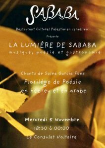 Sababa organise une soirée « La lumière de Sababa », le mercredi 5 novembre prochain à partir de 18h30 au Consulat Voltaire. L’inscription est obligatoire sur ce lien : https://www.leconsulat.org/events/la-lumiere-de-sababa-1/